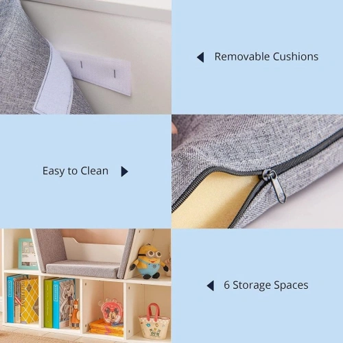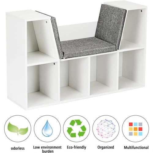 Голям капацитет: библиотеката има шест отворени отделения за съхранение на различни предмети като обувки, играчки, книги и декорации. В допълнение, двата горни дървени рафта от всяка страна не само позволяват на детето да се облегнете удобно, докато четете, но също така осигуряват допълнителен плот за поставяне на лампа или часовник.