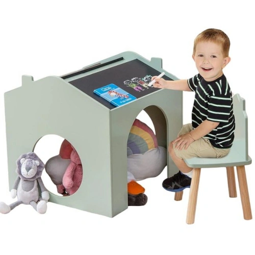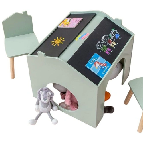Основната атракция на комплекта Детска маса с 2 столчета е мултиактивната къщичка, която педставлява Черна дъска за писане и рисуване. Тя предоставя безкрайни възможности за креативност и учене, като стимулира въображението на децата и развива техните творчески умения по метода Монтесори.