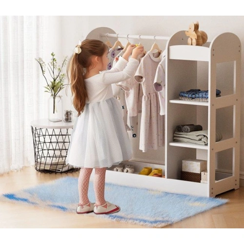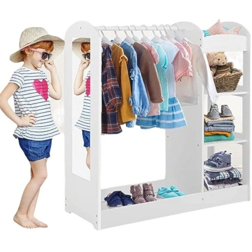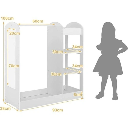 Практичната стойка за дрехи Ginger Home е удобно и функционално решение за организиране на детските дрехи, аксесоари и обувки. В елегантен бял цвят с огледало, което е безопасно и специално създадено за деца. Стойката е с перфектен размер за деца над 2-годишна възраст и е проектирана по метода Монтесори, да насърчава децата към самостоятелно обличане и подготовка. Детската стойка е достатъчно компактна, за да се впише във всяко пространство, но и достатъчно голяма, за да побере всички нужни вещи на вашето дете. Изработена е от висококачествено масивно дърво и MDF плоскости, което гарантирана издръжливост и дълготрайна употреба. Здравата конструкция и стабилният дизайн осигуряват безопасност и надеждност, което е особено важно за детските мебели. Детската стойка за дрехи с огледало е лесна за монтаж и поддръжка. Инструкциите за сглобяване са ясни и лесни за следване, което позволява бързото и безпроблемно инсталиране. Дървенията материал от който е изработена е лесен за почистване, което осигурява дълготраен и свеж вид на детския гардероб.