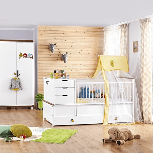 Бебешка кошара и детско легло 2 в 1 KAKULE съчетава функционалност и стил в едно иновативно решение за растящото дете. Горната част на конструкцията включва удобен модул с три чекмеджета и шкаф с рафт – идеални за подреждане на дрешки, пелени и аксесоари. В основата е разположено още едно, по-голямо чекмедже на колелца, което осигурява допълнително място за съхранение и лесен достъп. Когато детето порасне, страничните прегради и горният шкаф се премахват и леглото се трансформира в стандартно детско легло – едно дългосрочно решение, което расте заедно с вашето дете. Моделът е подходящ за матрак с размери 80 x 180 см. Дизайнът е семпъл и елегантен, с акценти от дървесен цвят и свежо бяло, които се вписват във всяка детска стая.
