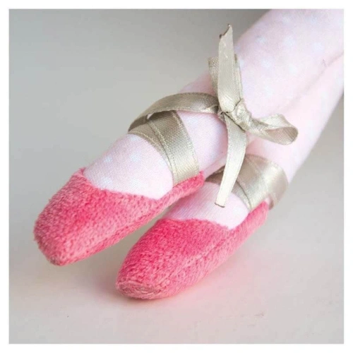 Елегантната балетна кукла е облечена в розова рокля с тюл и чорапогащи на точки, заедно с балетни пантофки.