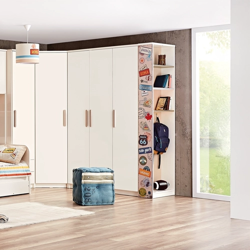 Функционален и стилен акцент към детския гардероб – страничният модул JOYIN съчетава удобство и декоративна стойност. Разполага с три практични рафта за книги, играчки или кутии, както и три метални куки за раници, шапки и аксесоари. Създаден да се комбинира с останалите модули от колекцията, този елемент допринася за завършения и организиран облик на детската стая.