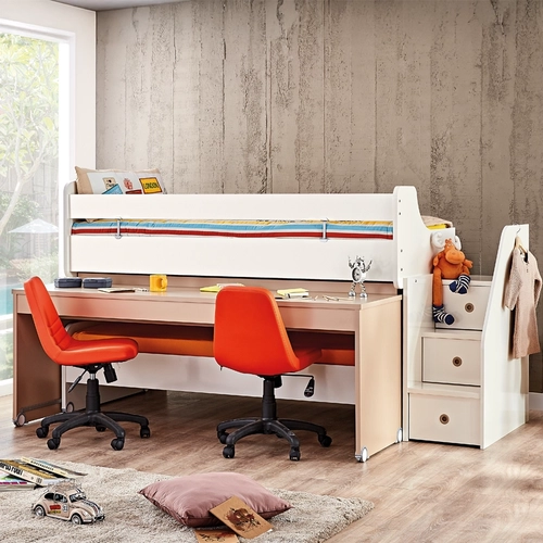 Детско легло с шкафчета JOYIN 90 х 200 комбинира функционалност и модерен стил, за да осигури комфортно и добре организирано пространство за сън и игра. Стълбата с три чекмеджета предлага лесен достъп до горното ниво, като същевременно предоставя практично място за съхранение на дрехи, играчки или аксесоари. Стълбата може да се монтира отляво или отдясно – според подредбата на детската стая. А при нужда от още функционалност, моделът позволява комбиниране с изтеглящо се долно легло или с прибираемо бюро от същата серия.