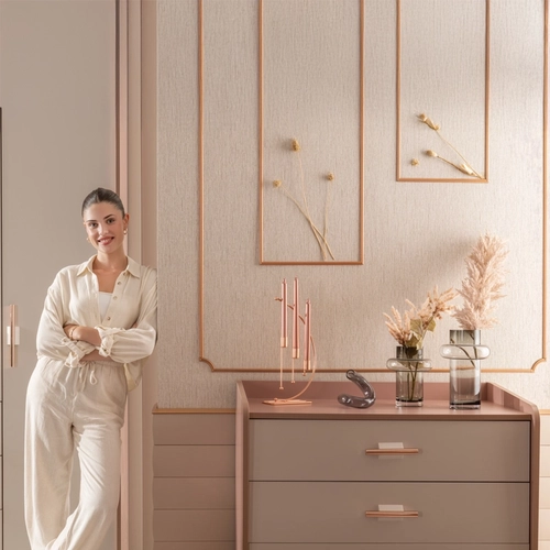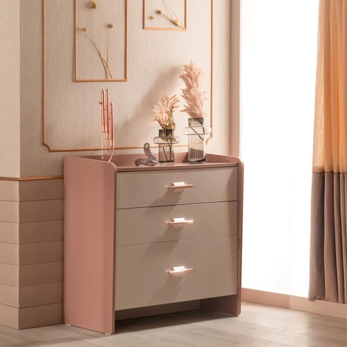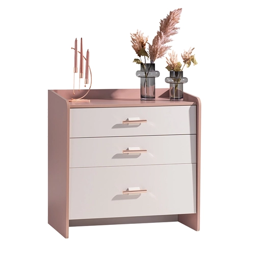 Детски скрин за дрехи ESTELLA съчетава функционалност, елегантност и безопасност. С три практични чекмеджета, той осигурява достатъчно място за съхранение на детски дрешки и аксесоари. Долното чекмедже е по-високо, което го прави особено подходящо за по-обемни вещи. Розово-златистите метални дръжки придават фин завършек и изискан акцент. Благодарение на вградената система с плавно затваряне, чекмеджетата се отварят и затварят меко и безшумно – за допълнително удобство и сигурност в детската стая.