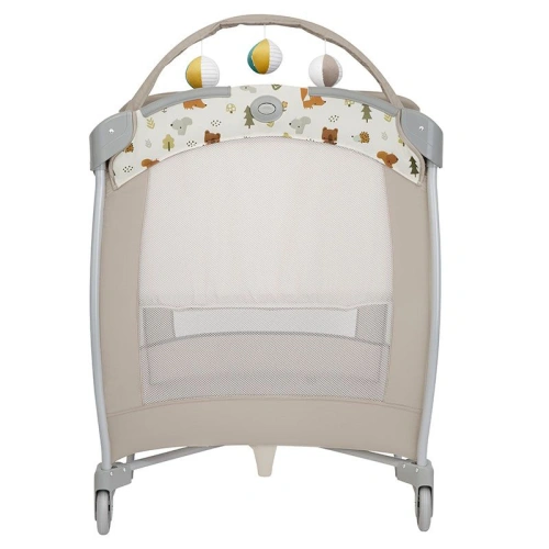 Готови ли сте да вземете тази кошара със себе си? Пренасяйте я лесно от стая в стая с помощта на 2-те колела. Сгънете я с едно лесно движение, като използвате характерното сгъване с бутон на Graco. След това използвайте включената удобна чанта за носене, за да направите пътуването лесно.