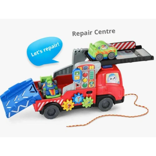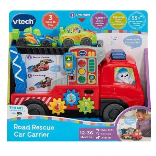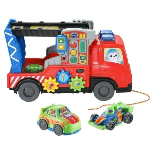 Преносим многофункционален спасителен транспортен камион VTech за товарене, спасяване и състезания. Поставете превозното средство вътре или на покрива на камиона, за да задействате забавни звукови ефекти и фрази. Завъртете бутоните за скорости, за да разпознаете различните инструменти и звуците, които издават. Модифицираната наклонена рампа образува супер бърза плъзгаща се писта, която изпраща два спортни автомобила обратно на пистата. Колкото повече играете, толкова повече забавни звукови ефекти можете да изследвате с над 55 мелодии, песни, звукови ефекти и фрази. Можете също да използвате въжета, за да дърпате камиона, за да настигнете скоростния спортен автомобил и да тренирате координацията на движенията си.