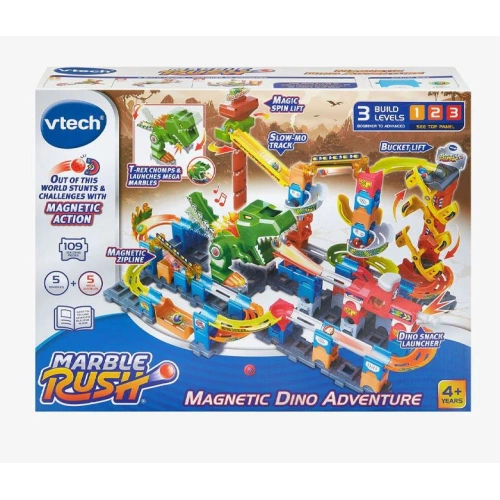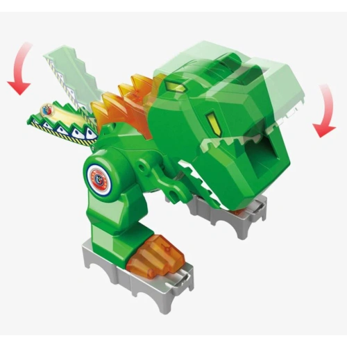 Електронният динозавър ще бъде осветен и ще може да възпроизвежда музика и звукови ефекти! Комплектът играчки включва 100 части и 10 топчета (5 обикновени топчета + 5 големи топчета, които могат да задействат магнитни функции). Изстрелвайте топчетата и гледайте как динозавърът захапва големите топчета и изпъва опашката си! Електрическият въртящ се асансьор транспортира топчетата до върха, така че можете да играете непрекъснато! Гледайте как спиралният асансьор бързо издига големите топчета! Включва 2 магнитни зиплайна, които могат да пренасят големите топчета през пролуките!