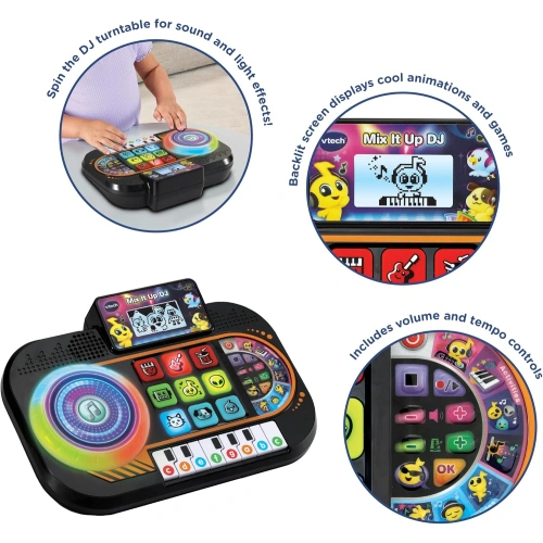 Влезте в DJ кабината с този черен DJ пулт от Vtech! Този интерактивен музикален миксер е пълен с функции, които вдъхновяват музикалното творчество. Децата могат да изследват различни звуци, инструменти и ритми, използвайки 25 ангажиращи бутона. DJ грамофона се върти за забавни звукови ефекти и светлини, а подсветеният дисплей показва ярки анимации, които се движат в ритъма.