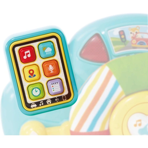 Ярки цветове, меки текстури и тонове забавления с ролеви игри изобилстват в този разноцветен бебешки волан от VTech! Задвижвани от въображение, малчуганите могат да управляват волана или да натискат клаксона за леко скърцане, преди да превключат предавки и да сменят лентите. Кой е това зад вас? Регулируемото огледало позволява на бебетата да проверяват отражението си, докато шофират. Включете радиото, проверете времето и слушайте трафика или изключвайте и включвайте климатика за сладки фрази за температурата. С каишки, които лесно се прикрепят към количките, и два педала за ритане, единственото липсващо нещо е шофьорската им книжка!