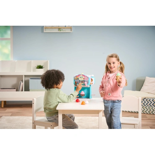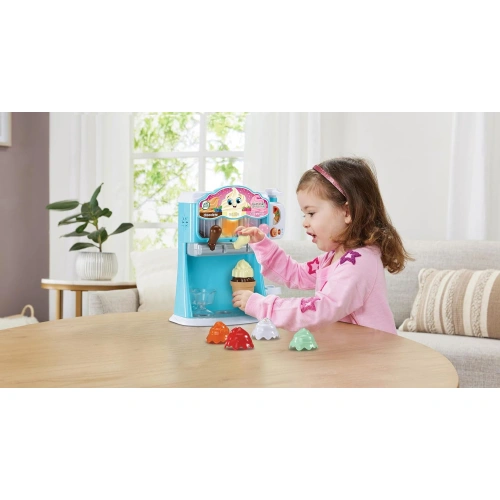 Започнете сладоледена вихрушка с машината за сладолед от LeapFrog. Тази ретро машина за сладолед се предлага в комплект с 12 въображаеми аксесоара за фантастично забавление с ролева игра. Натиснете бутона за поръчка на клиент, за да чуете въображаеми поръчки на клиенти, след което пуснете 6-те топки сладолед в горната част на машината и се пригответе за сервиране. Дръпнете лостовете, за да освободите сладоледа във фунийката или чашата и научете цветовете и вкусовете на сладоледа. Превключете превключвателя за добавяне на топинги, за да изберете един от четирите вкусни топинга, а за да завършите всичко, добавете малко сироп – вие избирате вкуса!