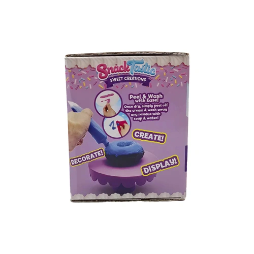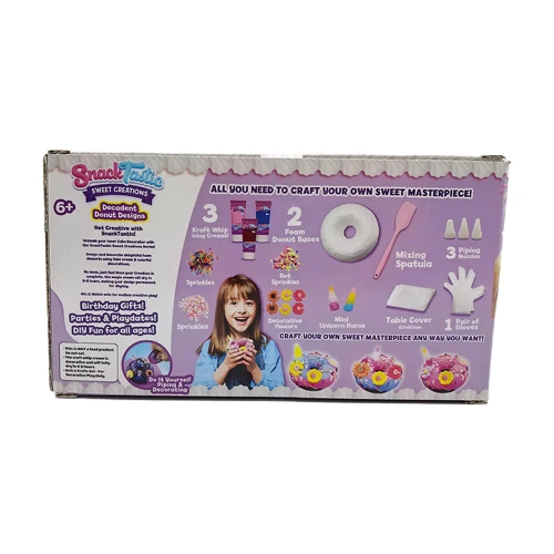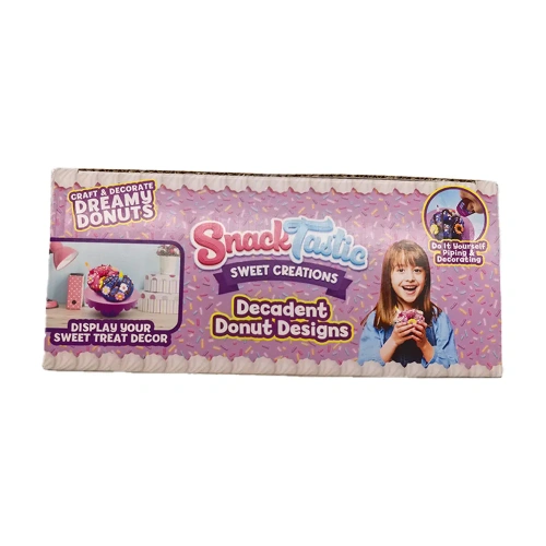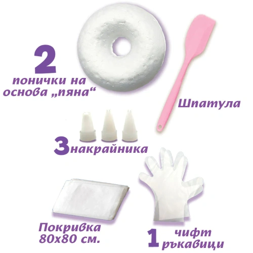 С този творчески комплект децата могат сами да „приготвят“ и украсяват сладки изкушения, вдъхновени от любимите на всички понички. В кутията ще откриете всичко необходимо за игра: материали за шприцоване и декорация, специален крем-глазура и различни поръски и декорации за завършек. Комплектът е подходящ за деца над 6 години и е идеален за развиване на въображението, фината моторика и креативността. Готовите „сладки шедьоври“ могат да бъдат изложени като част от играта или колекцията. Продуктът имитира храна. Не е предназначен за консумация!