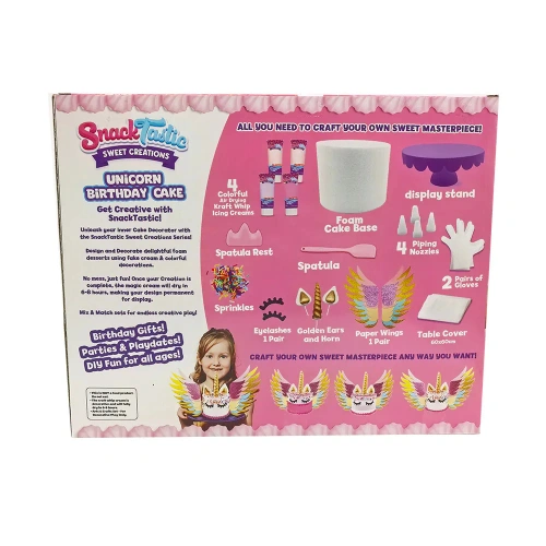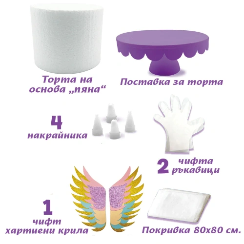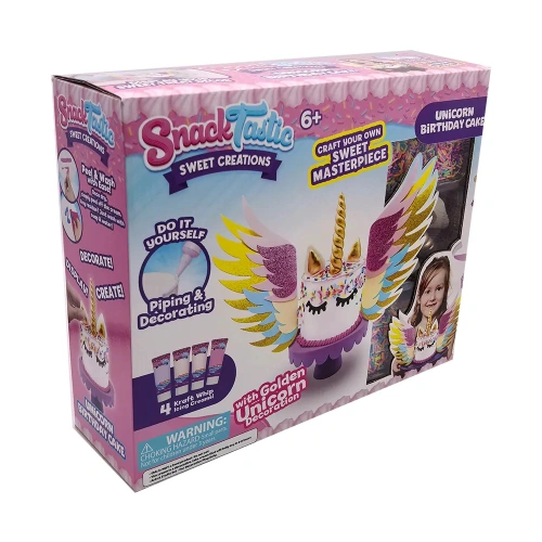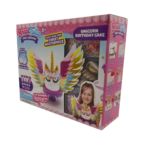 Вълшебна торта, пълна с цветове, блясък и сладост – перфектният акцент за рождени дни и празненства, изпълнени с радост. Очарователният дизайн с еднорог ще впечатли както децата, така и възрастните, а нежните слоеве пухкав блат и приказни вкусове превръщат десерта в истинска магия. В кутията ще откриете всичко необходимо за игра: материали за шприцоване и декорация, специален крем-глазура, поставка за торта, шпатула, ръкавици и поръски. Торта-мечта, която превръща всяко парти в незабравимо изживяване.
