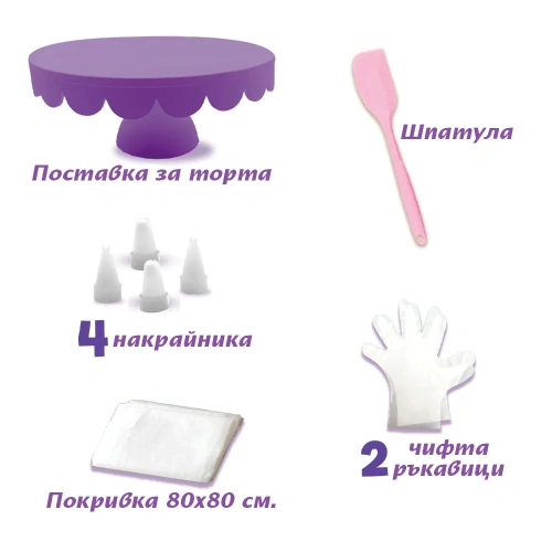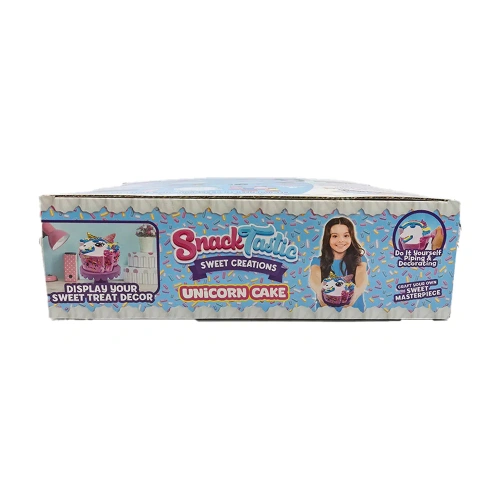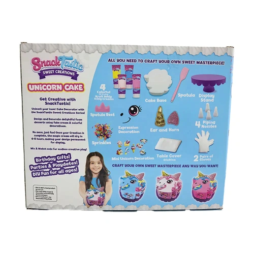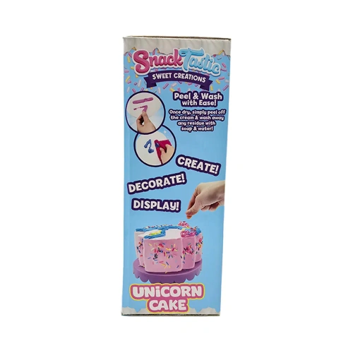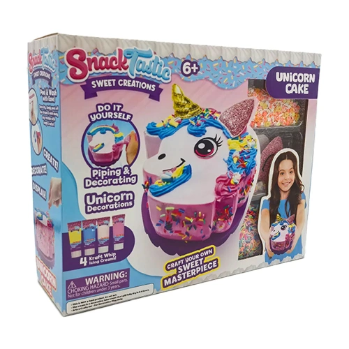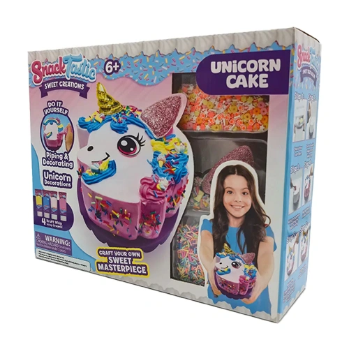 Вълшебна торта, пълна с цветове, блясък и сладост, във формата на еднорог – перфектният акцент за рождени дни и празненства, изпълнени с радост. Очарователният дизайн ще впечатли както децата, така и възрастните, а нежните слоеве пухкав блат и приказни вкусове превръщат десерта в истинска магия. В кутията ще откриете всичко необходимо за игра: материали за шприцоване и декорация, специален крем-глазура, поставка за торта, шпатула, ръкавици и поръски. Торта-мечта, която превръща всяко парти в незабравимо изживяване.