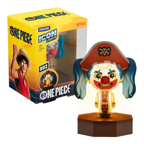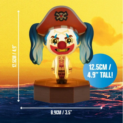 Лампа светеща фигурка Buggy – One Piece Осветете следващото си приключение с тази светеща фигурка Buggy. Висока 12 см (4,7\"), 3D фигурката е оформена като Бъги Клоун от One Piece. Включете светлината, за да добавите меко, топло сияние във всяка стая, на нощното шкафче или на рафта. Работи с 2x AAA батерии (не са включени) – без нужда от кабели. Buggy Icon Light е чудесен колекционерски артикул за дома и перфектен подарък за фенове на Netflix live-action сериала. Официално лицензирано One Piece изделие