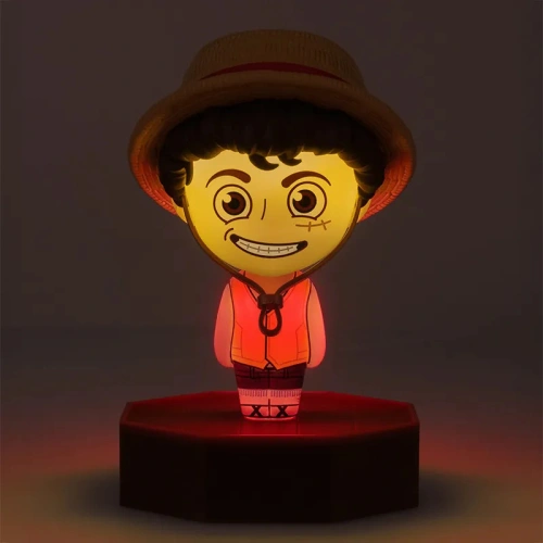 Лампа Monkey D. Luffy – One Piece Отплавайте на приключение с тази впечатляваща колекционерска 3D фигурка - лампа , представяща легендарния пиратски капитан Monkey D усмихнат, с червения си елек и характерната сламена шапка. Пиратът е поставен върху пластмасова основа, имитираща дърво от пиратски кораб. Официално лицензиран продукт отбелязва вечната популярност на обичаната поредица One Piece. Независимо дали сте опитен колекционер или нов фен на анимето, тази фигурка със сигурност ще запали вашето чувство за приключение и въображение. С фигурката на Monkey D. Luffy можете да преживеете отново вълнението и приятелството на Пиратите. Лампата излъчва меко, топло сияние, което я прави идеална като нощна лампа.
