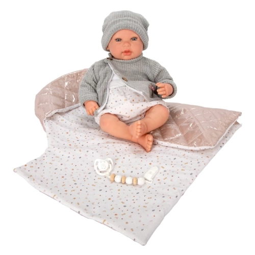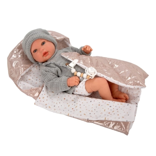 Кукла-бебе Оливия със сива вълнена жилетка и спален чувал 45 см