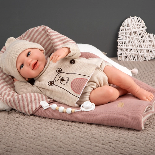 Усмихната кукла-бебе Лейн с розов спален чувал и биберон 45 см