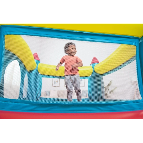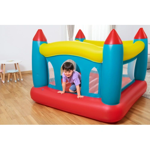 Батутът във формата на замък се предлага в ярки цветове и атрактивен дизайн. Той е надуваем и лесен за пренасяне. Материята е мека и издръжлива, така че да не се износва лесно. С предпазна мрежа от всички страни. Идеално за развиване на двигателните умения и координацията. Подходящ за игра както навън, така и вътре.