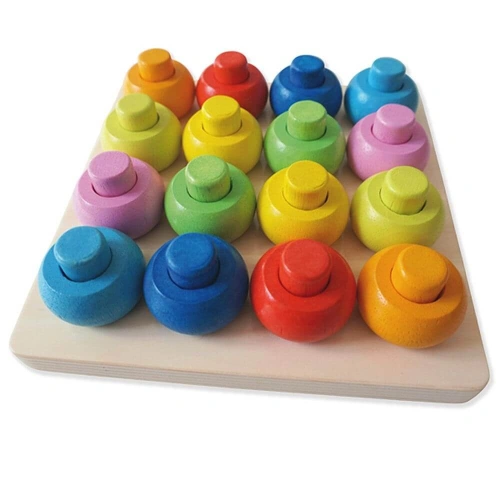 Комплектът съдържа 32 части в осем цвята - 16 мъниста и 16 пръчки, както и дървена дъска с дупки за основа.