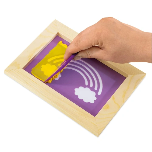В комплектът ще намерите: Дървена рамка за ситопечат, 3 x 35 ml бутилки с мастило, 8 шаблона, чистачка, 4 големи листа стикери и водач.