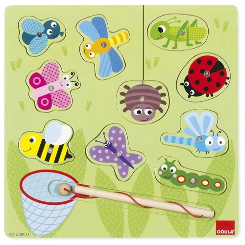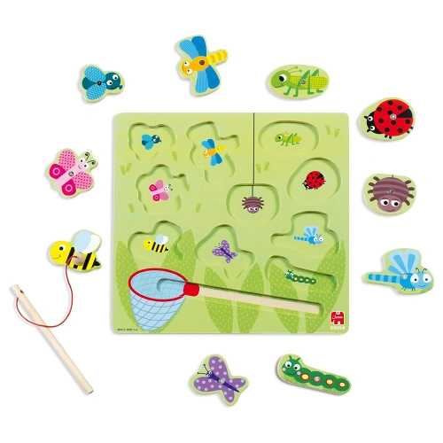 Време е малките откриватели да се научат да ловят насекомите. В комплектът има въдичка с магнит, с която децата да хващат насекомите, а след това има картинки, които помагат като пъзел да се върнат по местата им.