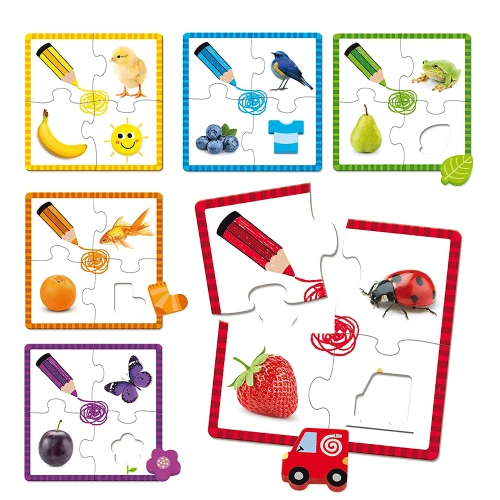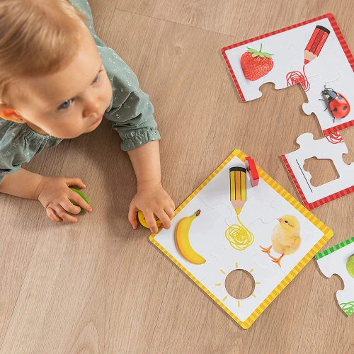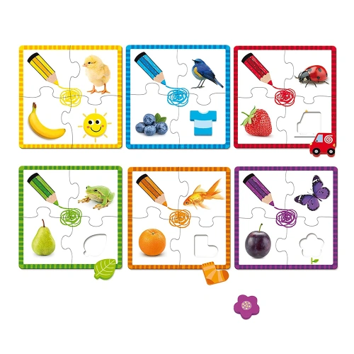 Комплекта включва 6 различни пъзела. Всеки пъзел се състои от 4 части, като всеки от тях е в различни цветове: жълт, син, зелен, оранжев, лилав и червен.