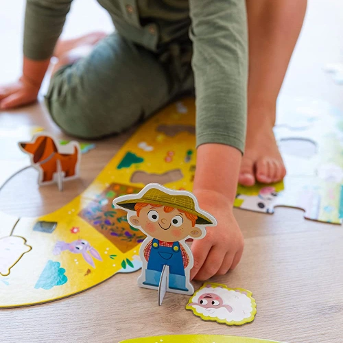 Представяме Ви забавен и образователен пъзел, който ще запознае малчуганите с животните от фермата! Състои се от 18 едри елемента. Наредете всички части, за да получите голяма ферма. Към комплекта има фермер и кученце, с които детето ви ще може да играе.