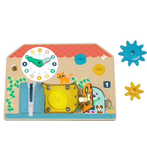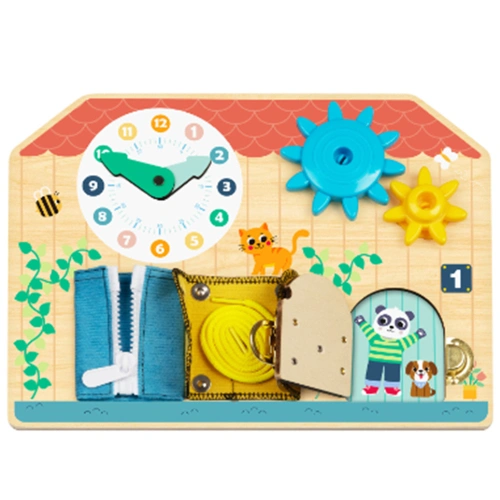 Оформена е като симпатична къщичка с вградени дейности от всички страни – включително работещ часовник, ципове, бравички, зъбни колела и различни текстури. Всичко това помага на децата да развият фина моторика, координация, сръчност, логическо мислене и основни практически умения.
