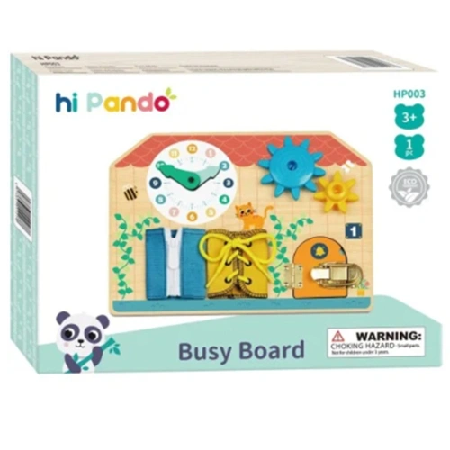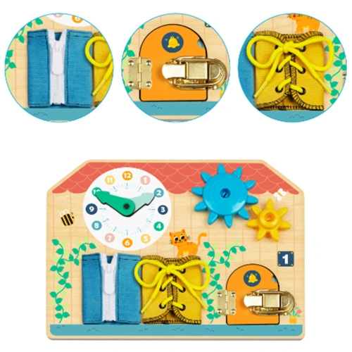 Предлагаме на Вашето внимание перфектен избор за развитие на фината моторика, логическото мислене и ежедневни умения на детето Ви - активна дървена дъска – бизиборд Къща с часовник!