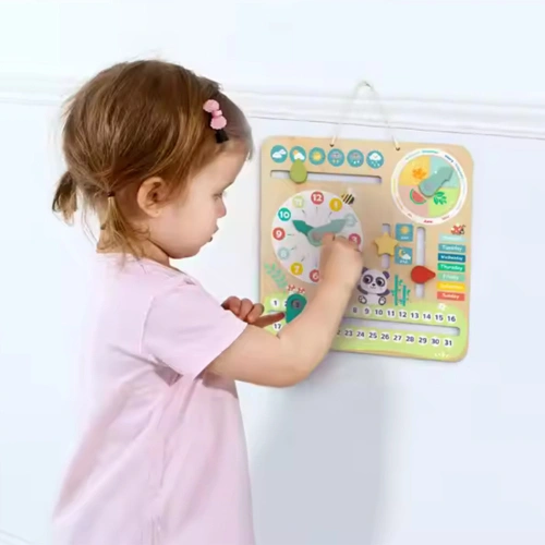 Тази дървена играчка с календар и часовник е проектирана да помогне на децата да усвоят основни понятия като време, дати, сезони и метеорологични условия. Благодарение на интерактивния си дизайн и подвижните елементи, тя стимулира любопитството, координацията и логическото мислене.