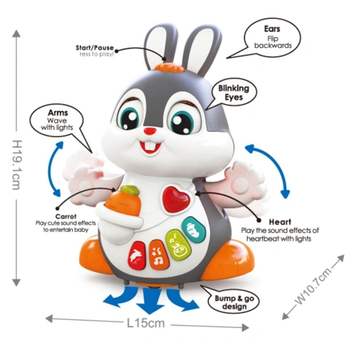 Зайчето се движи, има различни мелодии, сила на звука, пее и танцува.