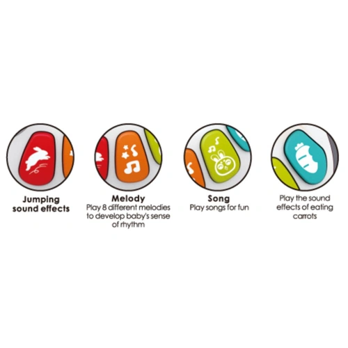 Различните бутони активират различни функции. Звуков ефект на сърцебиене за успокояване на бебето, други мелодии, които ще развият усещане за музика и ритъм, също така зайчето може да мига с очи и свети. Може да сгънете ушичките на зайчето назад и после пак да ги върнете обратно.