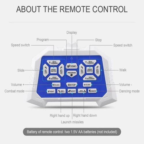 Дистанционно управление със специални режими: демонстрация, бойни функции (Fight, Shoot), танцови програми, регулиране на скорост и звук, управление на ръце и походка