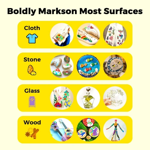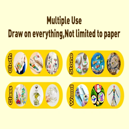 Комплектът включва 36 наситени и ярки акрилни маркери, подходящи за хартия, картон, плат, дърво, стъкло и други повърхности, като осигуряват богата пигментация, гладко нанасяне и дълготрайни цветове. Маркерите са нетоксични и безопасни, което ги прави идеални за деца и за творчески занимания у дома или в училище.