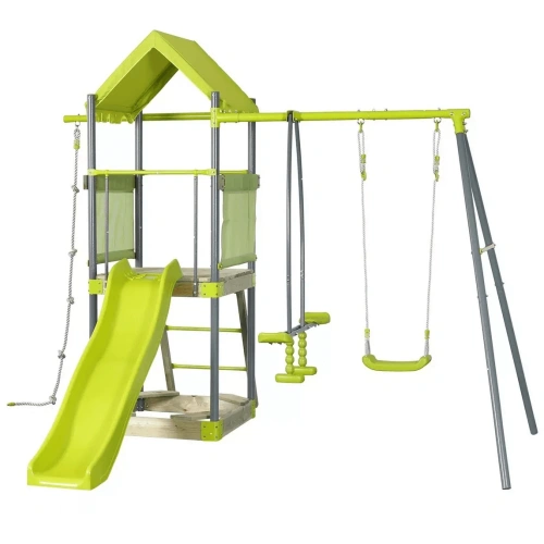 Green For Swing Set е модулно съоръжение за детска игра, създадено да обогати дворното пространство с множество възможности за активност, безопасно движение и забавление. Комбинирайки люлки, пързалка, катерене, пясъчник и „крепост“ с покрив, този комплект прави дома — градината — истински кът за игра и развитие.