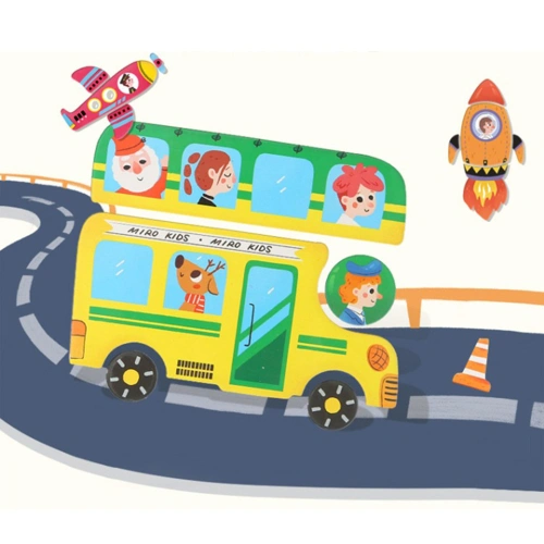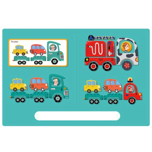 Комплектът включва 10 различни карти с цветни картинки на различни превозни средства – от коли, автобуси и камиони, до кораби, самолети и влакове. Всяка карта показва сцена с определено превозно средство, а задачата на детето е да подреди правилните магнитни части върху магнитната повърхност, за да сглоби картината. Това подпомага логическото мислене, концентрацията и фината моторика.
