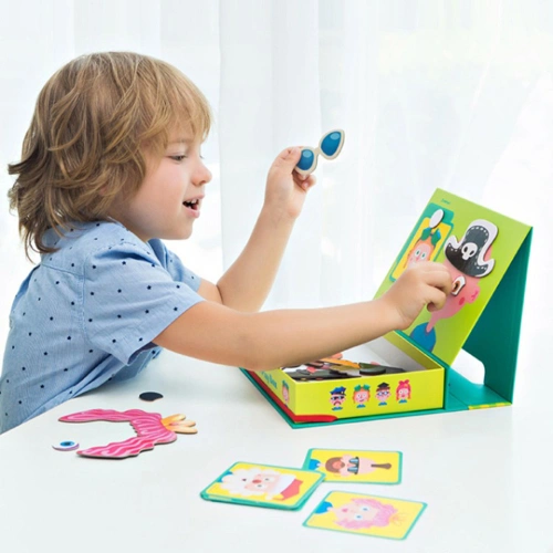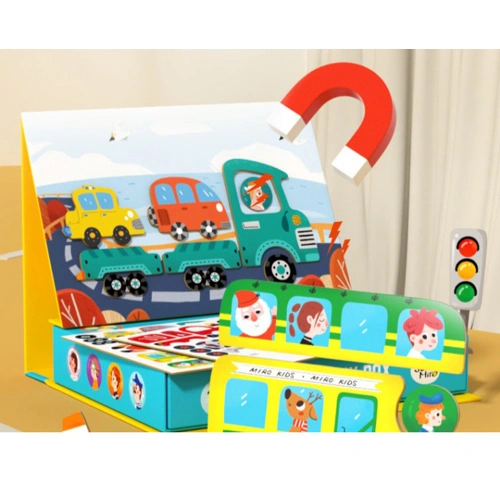 Магнитната книга е с удобен куфарен дизайн, което я прави изключително практична за пътуване, съхранение и подреждане. Всички елементи се прибират вътре в „куфара“, така че няма опасност от загубване на части. Децата могат да играят самостоятелно или с помощта на родител, като играта развива и комуникативните умения.