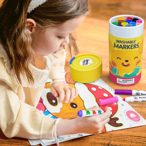 Изработени с мисъл за безопасността и удобството на децата, всеки маркер е с капаче, което не се поглъща, и мастило, което се почиства лесно от кожа, дрехи и повърхности само с вода. Маркерите не изсъхват бързо, което ги прави издръжливи и подходящи за продължително използване.