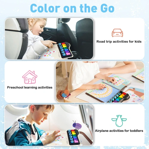 Книжката съдържа разнообразни тематични страници – животни, букви, време, плодове и други. Така децата не само рисуват, но и учат нови понятия и опознават света около тях, докато играят. Използването на геометрични щампички подпомага ранното разбиране на формите и фигурите. Мастилата са миещи се и безопасни – лесно се почистват с влажна кърпа или салфетка, без да оставят петна.