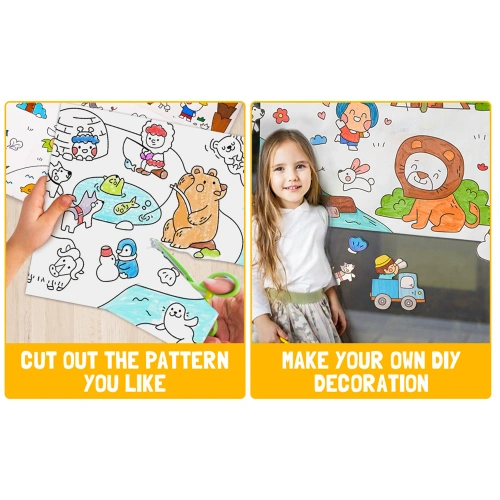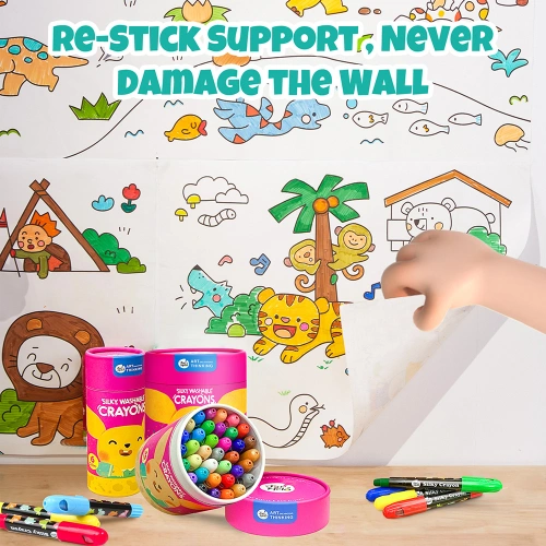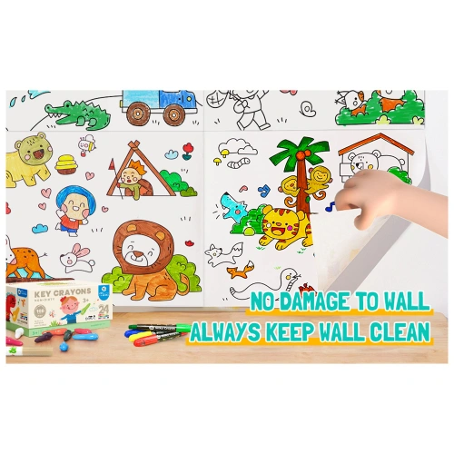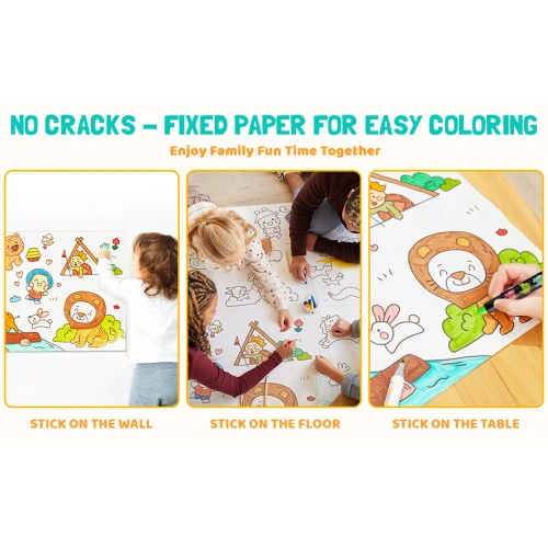 Хартията е самозалепваща и може да се залепи безопасно върху всякакви гладки повърхности – стена, под, маса – без да оставя следи при отлепяне. Детето може да оцветява удобно, където пожелае, без нужда от помощ. Подходяща за флумастери, пастели, моливи и водни бои.