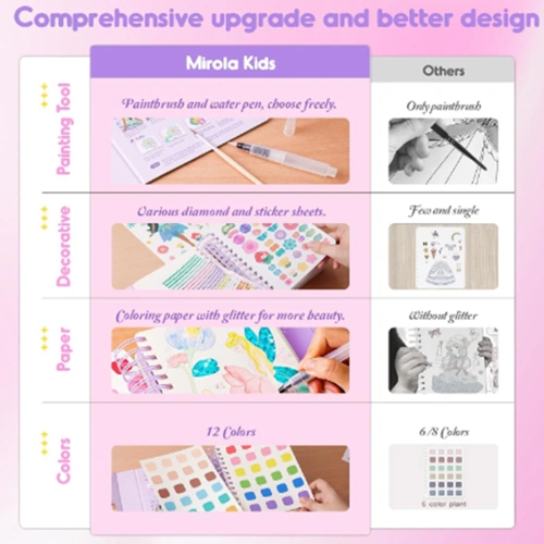 Рисуване и оцветяване: Включва 48 акварелни бои (12 цвята) и 6 страници за оцветяване, за да създадеш свой собствен приказен стил!