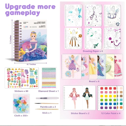 Компактната и практична книга (18 × 20 см.) съдържа над 1000 аксесоара и материали – всичко необходимо за малките модни дизайнери: хартия за рисуване, стикери, диаманти, четки и още много!