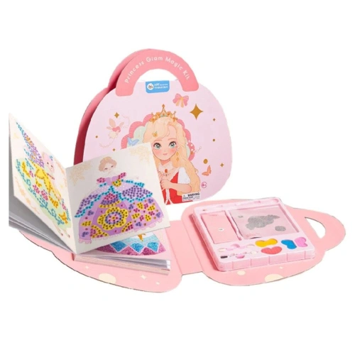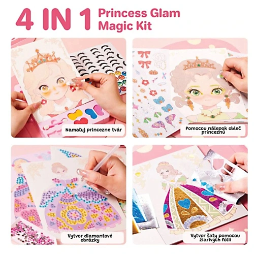 Комплектът съдържа 25 броя картони с изображения на принцеси, които децата могат да обличат, декорират и гримират по свой вкус. Включени са 5 листа със стикери за декорация, 5 листа с фолио и блестящи камъни, както и 4 пакетчета с разноцветни камъчета, които придават на всяка принцеса уникален и сияен стил.