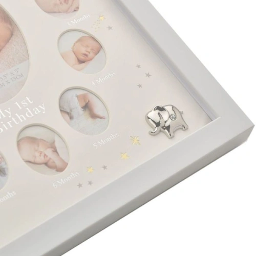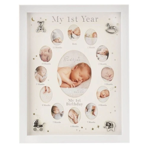 Запазете най-ценните моменти от първата година на вашето бебе с тази елегантна колаж рамка \"My 1st Year\" от Bambino. С 12 малки овални отвора за снимки от всеки месец и един централен за първия рожден ден, рамката предлага стилен и емоционален начин да проследите растежа на вашето дете. Декоративните елементи – сребърно мече, конче, количка и слонче – добавят чар и нежност, превръщайки рамката в идеален подарък за новородено или кръщене.