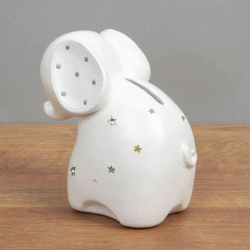 Нежна и стилна касичка във формата на слонче, създадена да съхранява първите спестявания и спомени на вашето дете. С изчистен бял дизайн, звездни изрезки и блестящи камъчета, тя е идеална за декорация на детска стая или подарък за новородено.