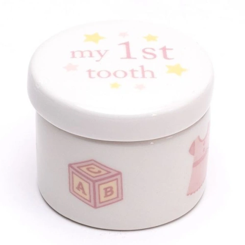 Създаден с внимание към детайла, този очарователен комплект включва керамична касичка \"Piggy Bank\" и две мини кутии за съхранение на първите спомени – \"My 1st Tooth\" и \"My 1st Curl\". С пастелни илюстрации на бебешки аксесоари и нежни звезди, комплектът е идеален подарък за новородено, кръщене или първи рожден ден. Перфектен за родители, които искат да запазят най-ценните моменти от ранното детство.