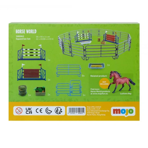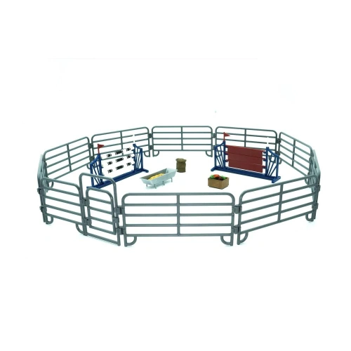 Комплектът включва: 9 броя сиви огради, 1 врата за ограда, 2 препятствия за прескачане, 1 щайга с храна за коне, 1 чувал с фураж и 1 хранилка.