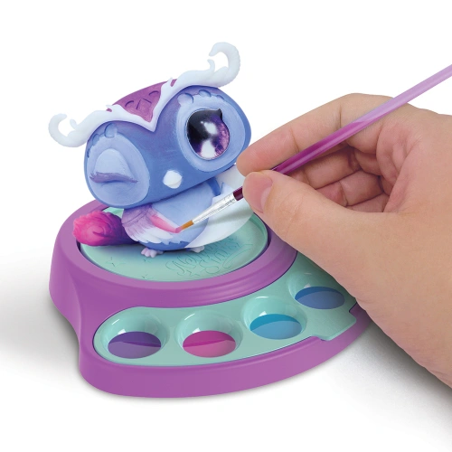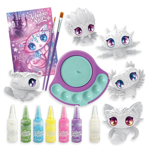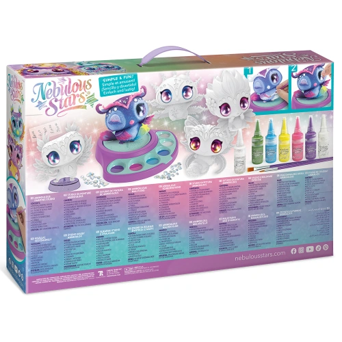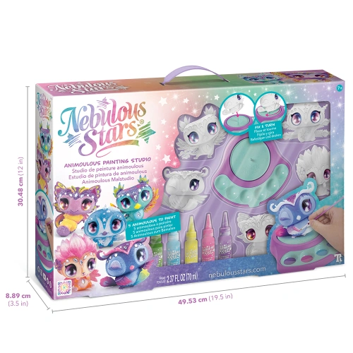 Превърни се в истински малък художник с уникалното рисувателно студио от Nebulous Stars! Благодарение на въртящата се платформа за рисуване, ще можеш да оцветиш 5 очарователни животинки от серията Animoulous, всяка със светещи очи и бляскав завършек!