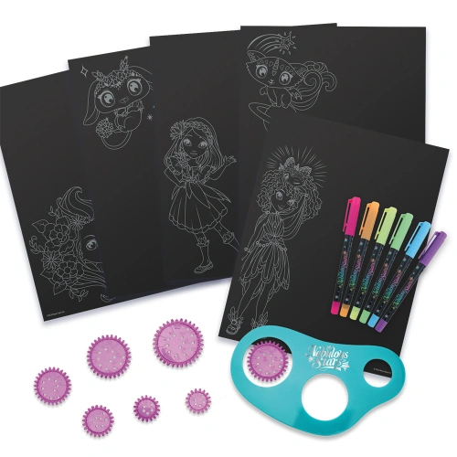 Създавайте впечатляващи неонови спирали и мандали, украсявайте любимите си героини с гел писалки и блестящи стикери и се потопете в галактическо творческо приключение.