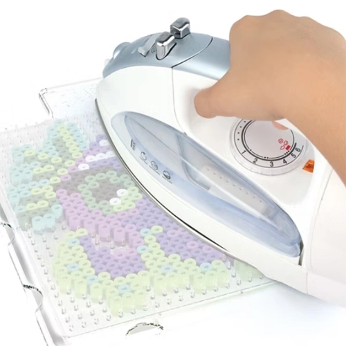 Подреди мънистата по шаблона, покрий с хартия и изглади с ютия (с помощта на възрастен). След като изстинат, фигурите са готови за игра, украса или дори за сглобяване на 3D фенер!